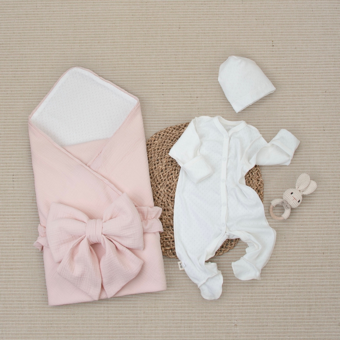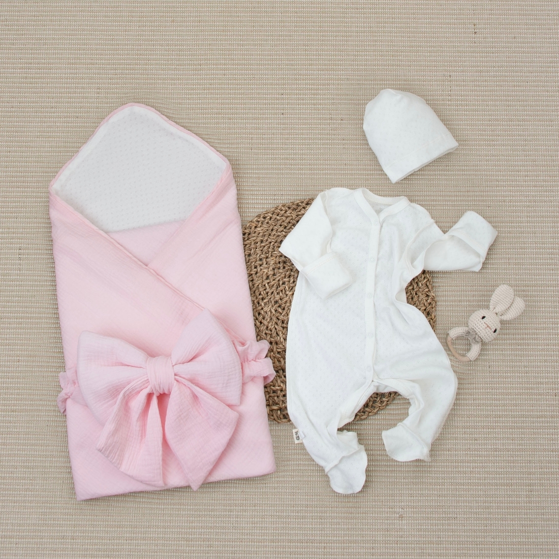 Комплект на выписку 4 предмета "Ажур.Муслин Плед", пудра, лето
