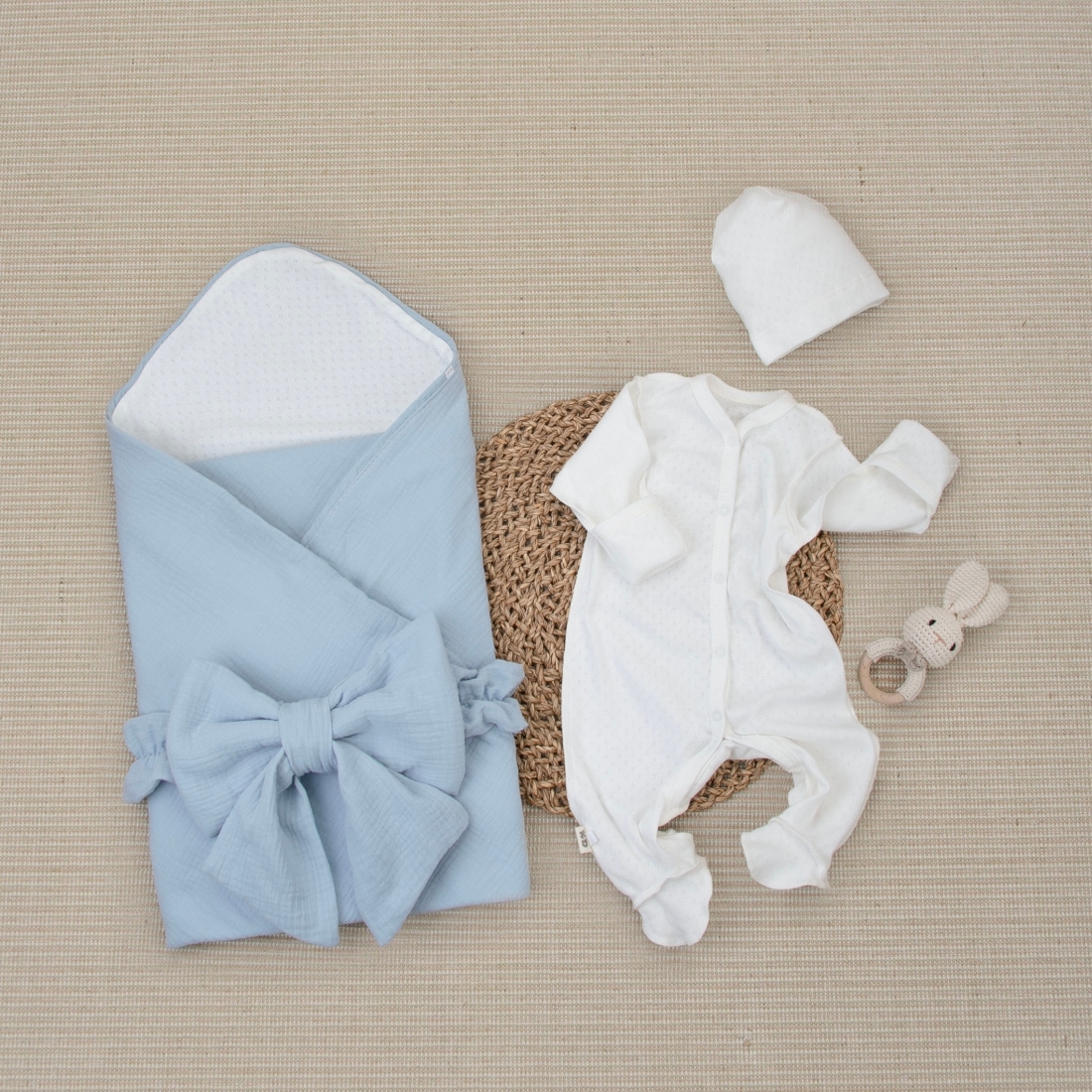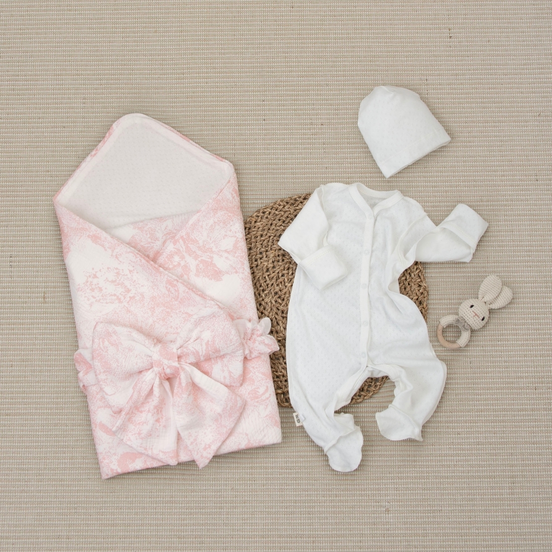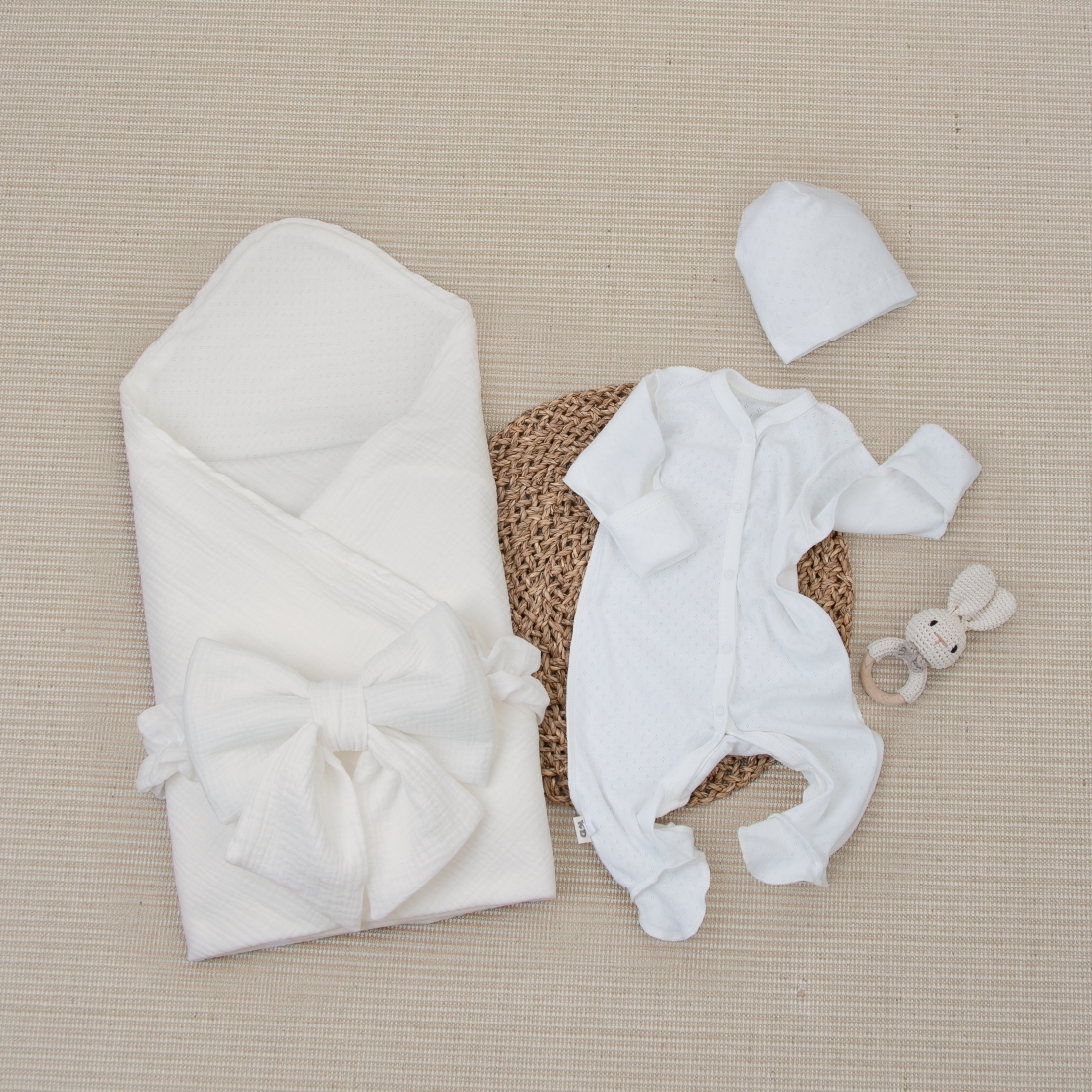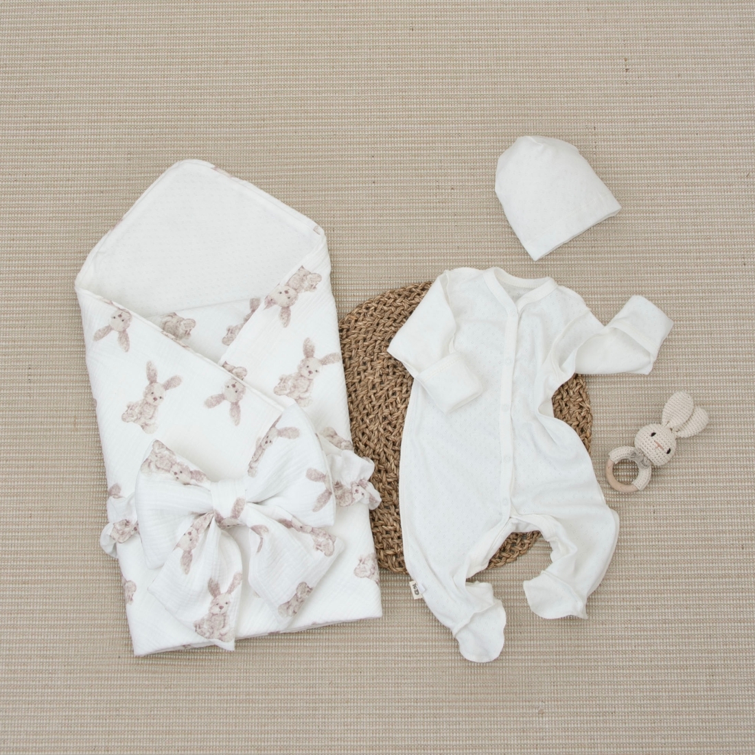 Комплект на выписку 4 предмета "Ажур.Муслин Плед", зайки, лето