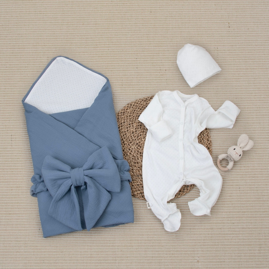 Комплект на выписку 4 предмета "Ажур.Муслин Плед", джинс, лето