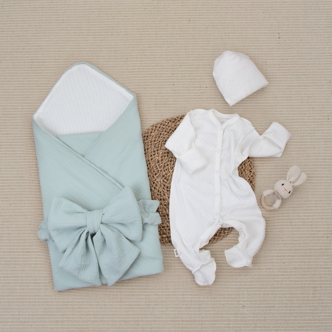 Комплект на выписку 4 предмета "Ажур.Муслин Плед", полынь, лето