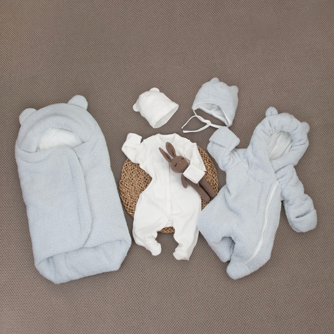Комплект на выписку 5 предметов "Пушистик Пуговка", демисезонный, светло-серый