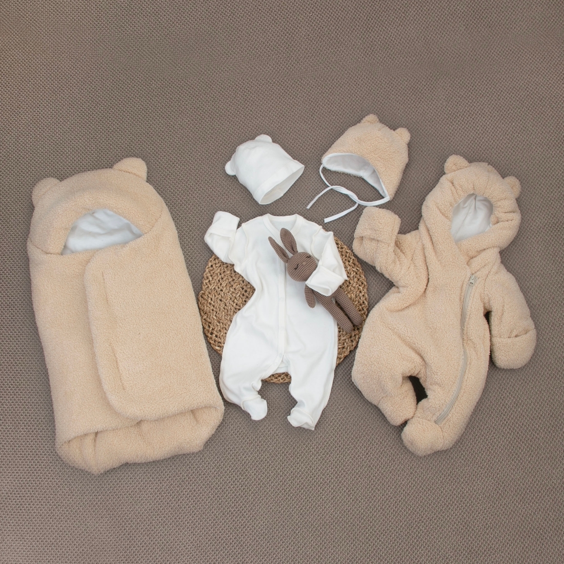 Комплект на выписку 5 предметов "Пушистик Пуговка", демисезонный, светло-бежевый