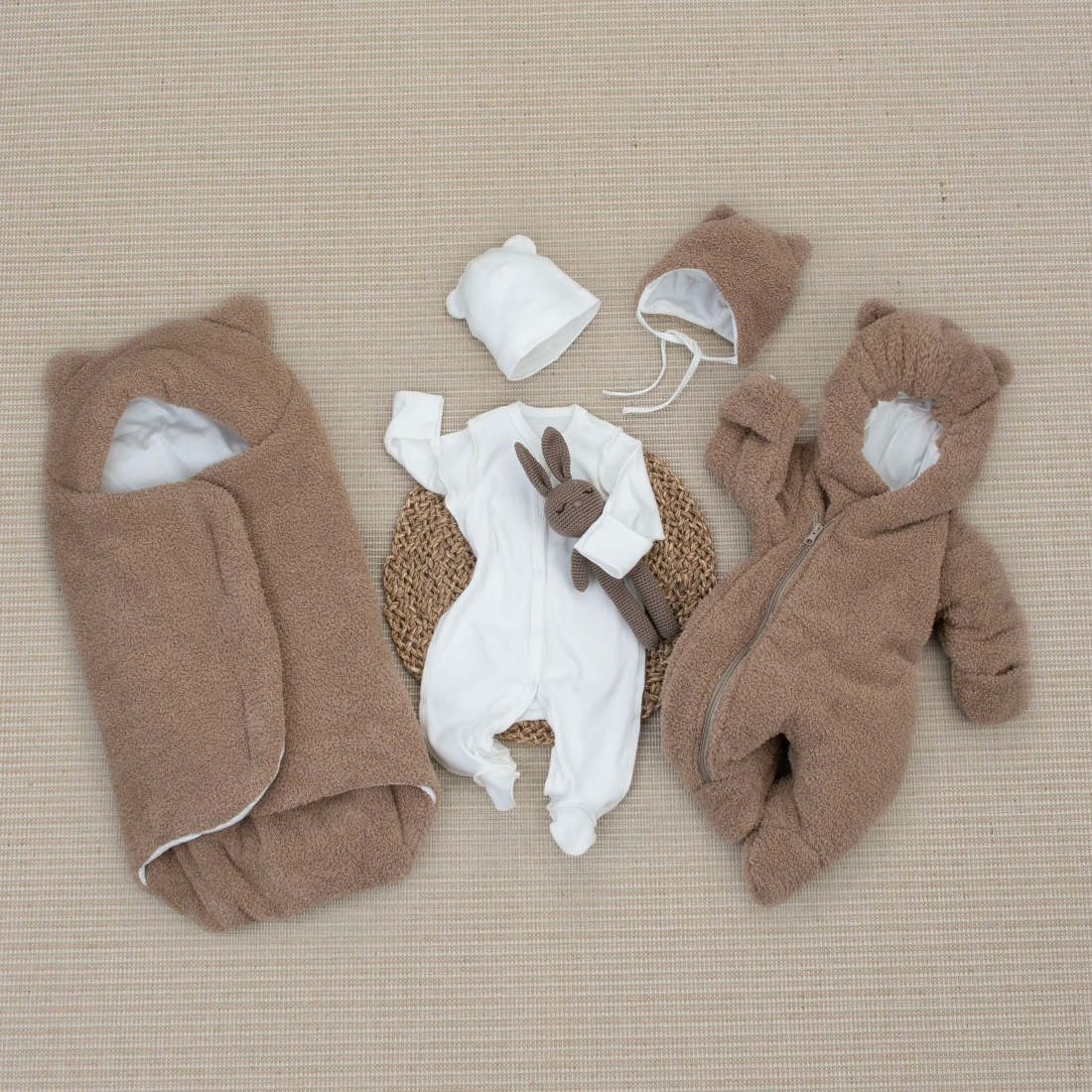 Комплект на выписку 5 предметов "Пушистик Пуговка", демисезонный, бежевый