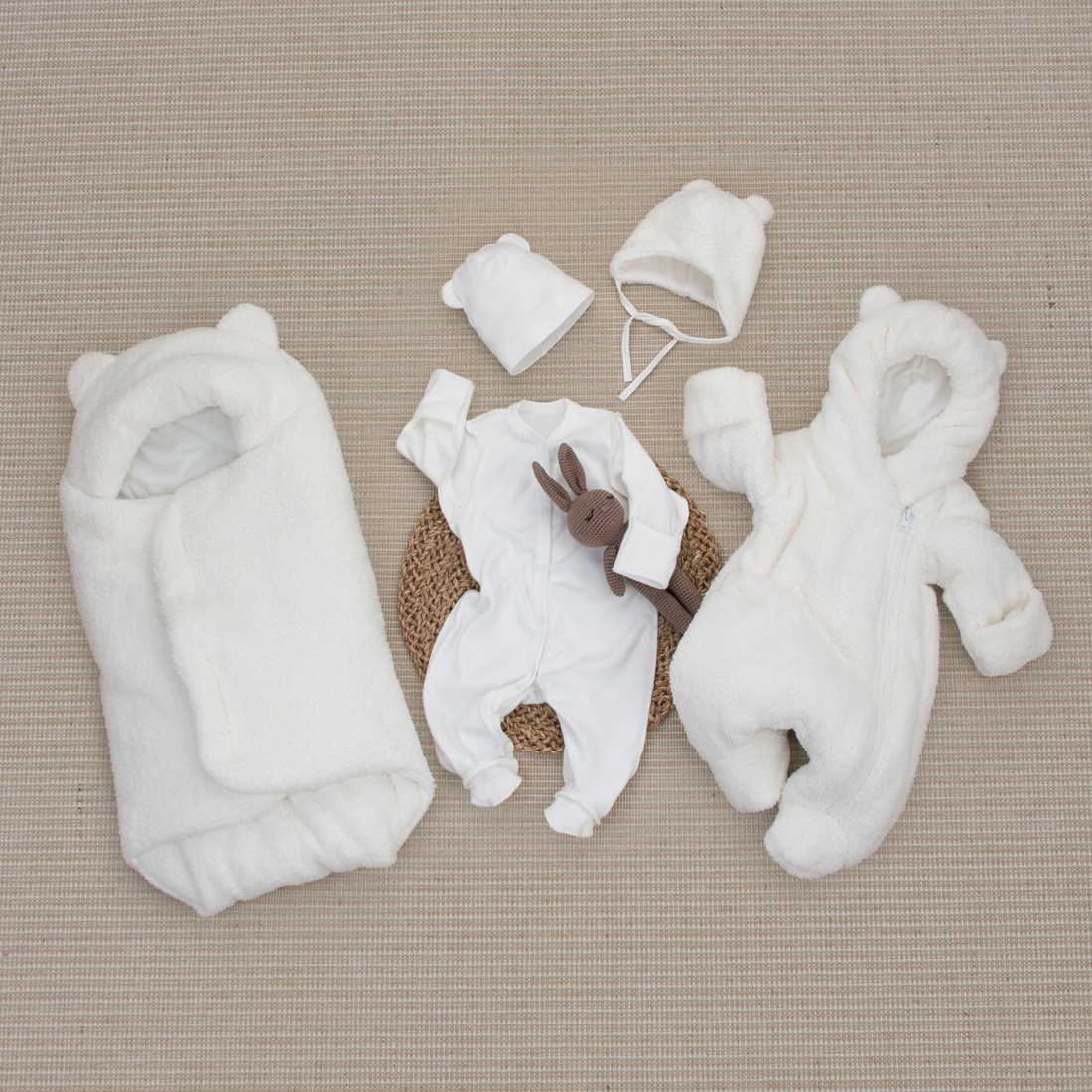 Комплект на выписку 5 предметов "Плюшевая Скандинавия", с опушкой, зимний, белый