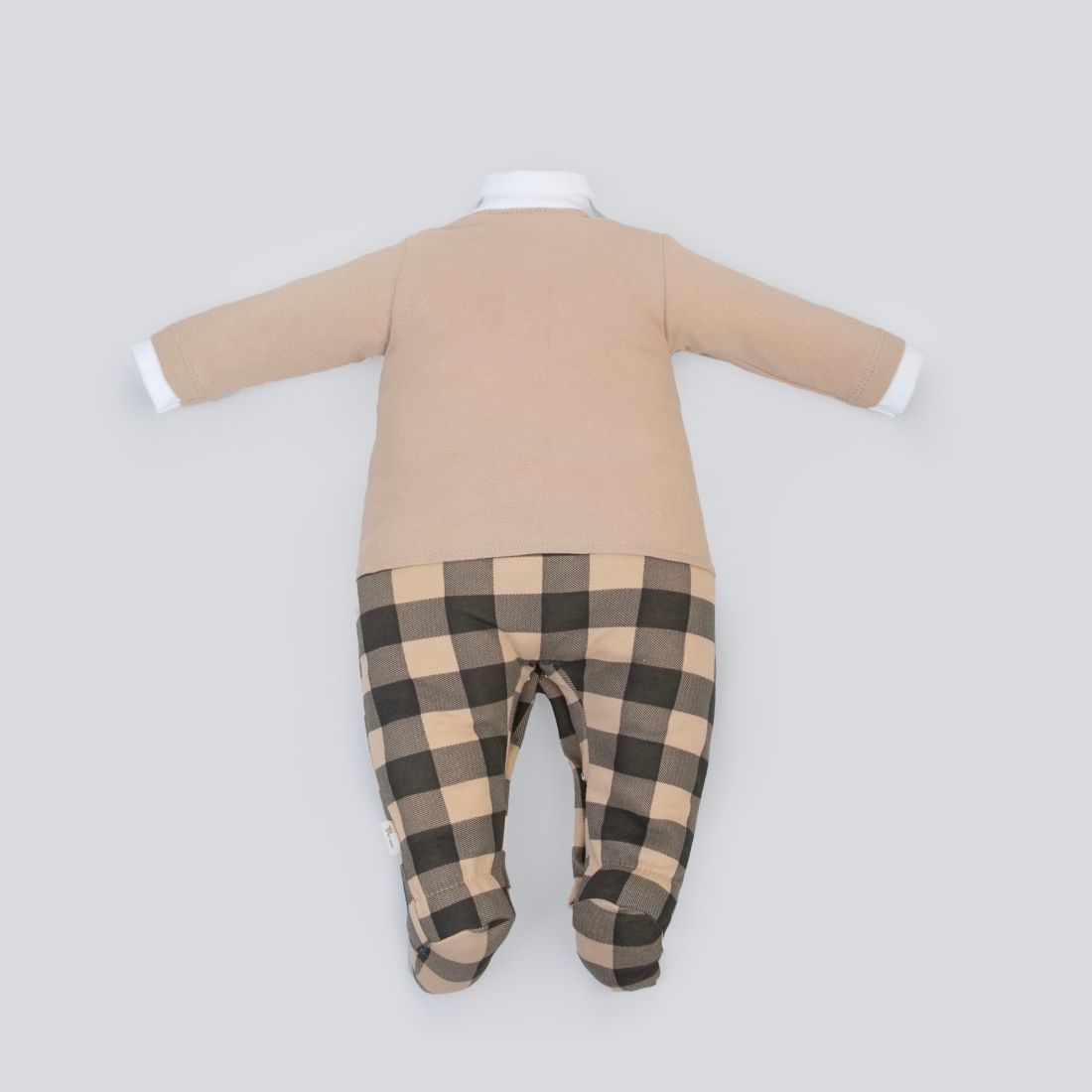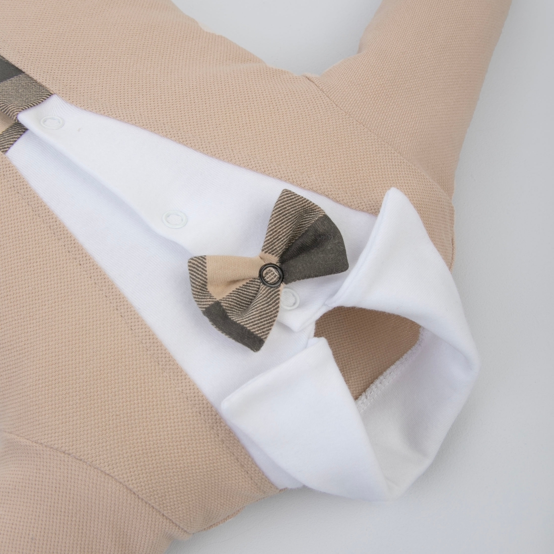 Цвет: Смокинг капучино меланж, рубашка белый, брюки, шапочка и бабочка черная клетка на бежевом