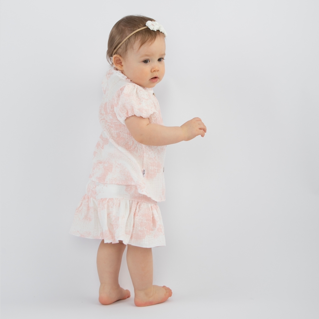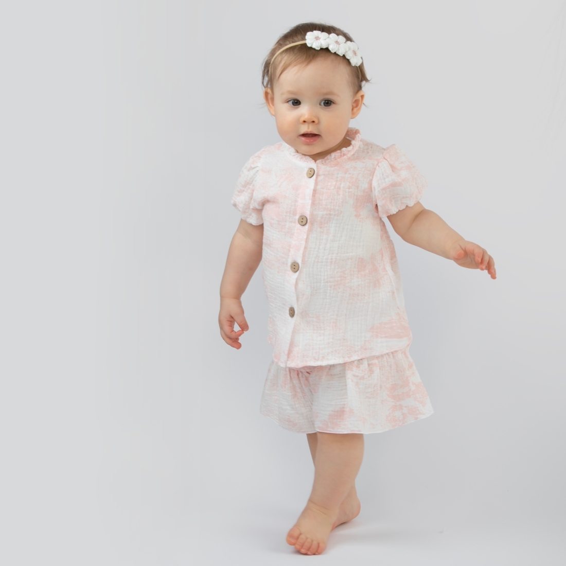Свободный крой топа не будет стеснять движений малышки, застежка на пуговках по передней половинке.