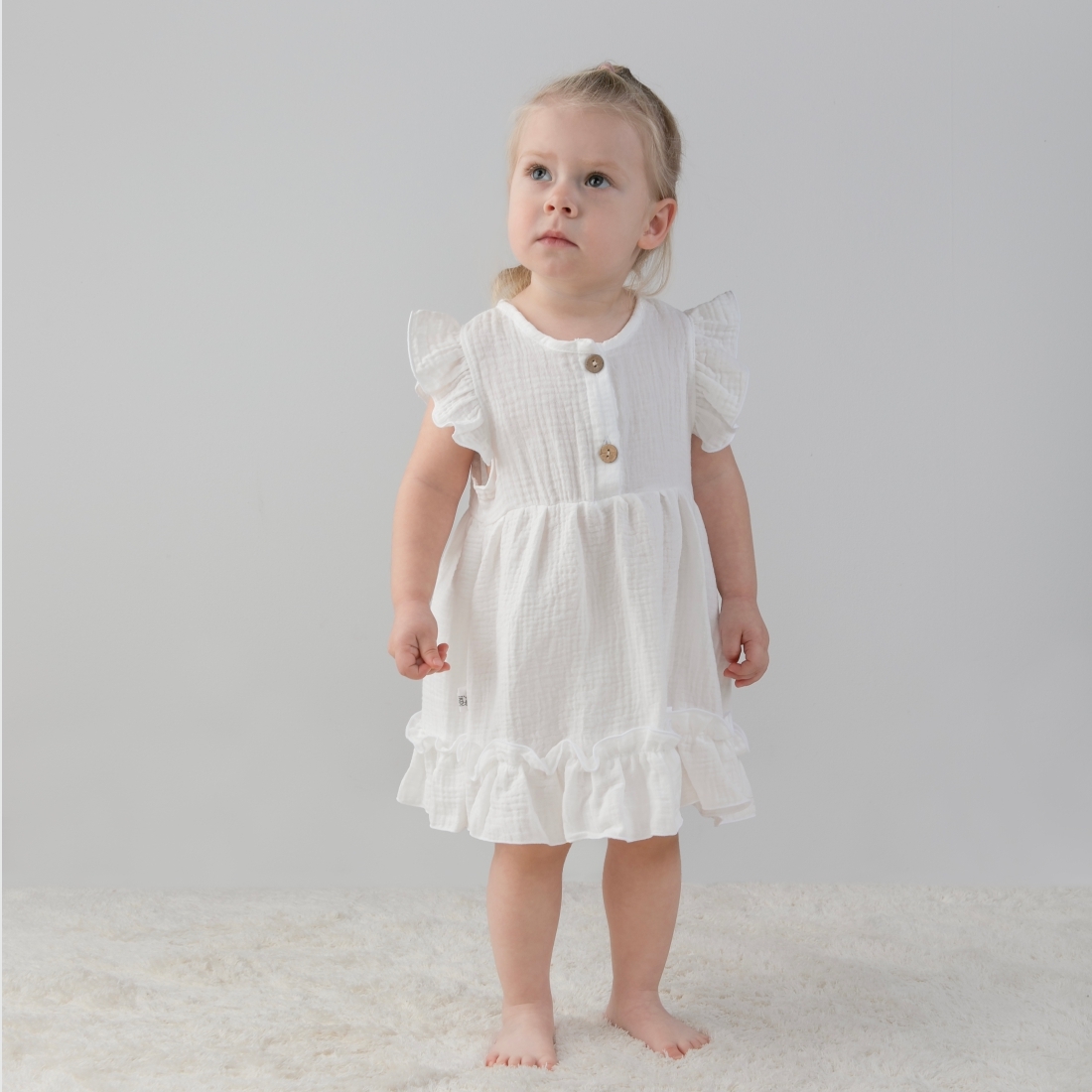 Летнее платье Муслин с крылышками вместо рукавов, застежка пуговицы на полочке, подходит для детского сада.
