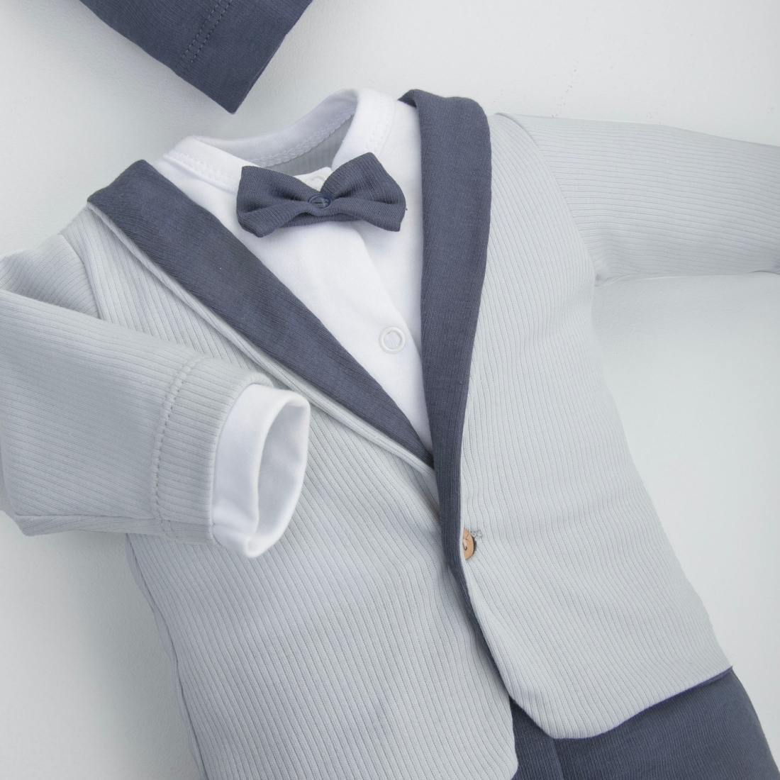 Цвет: Пиджачок интерлок рубчик серый, рубашка белый, брюки, шапочка и бабочка серый