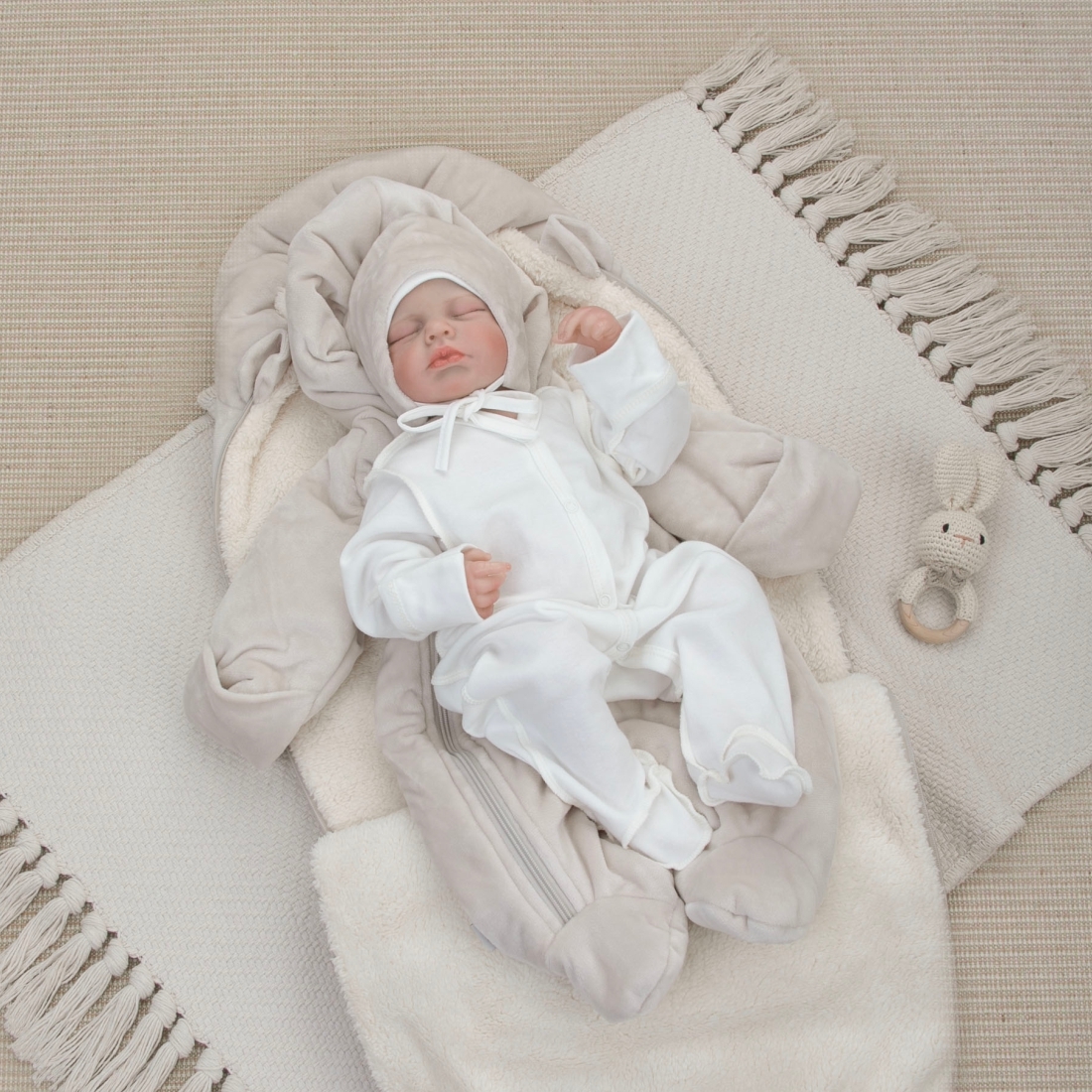Цвет конверта, комбинезона, шапка: жемчуг