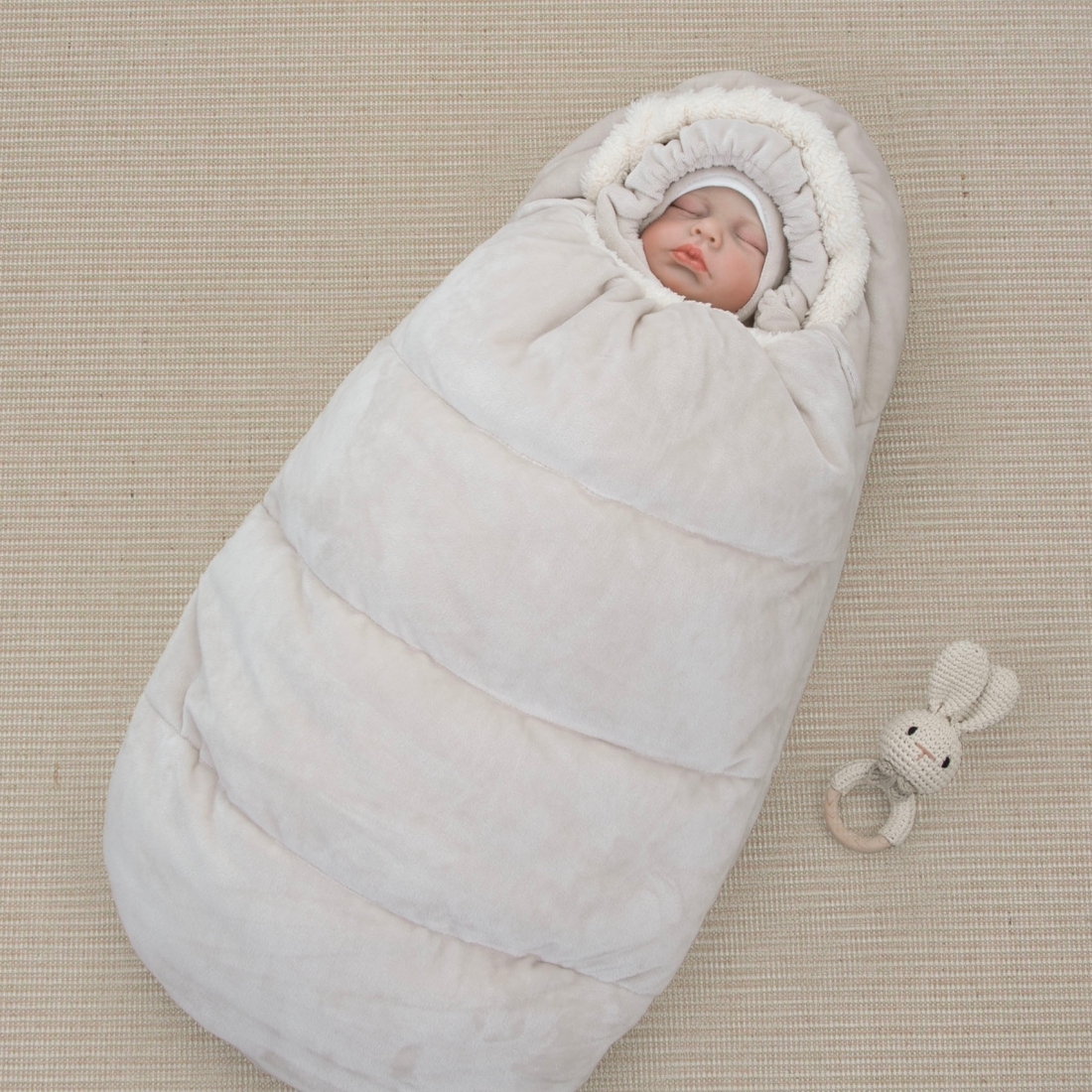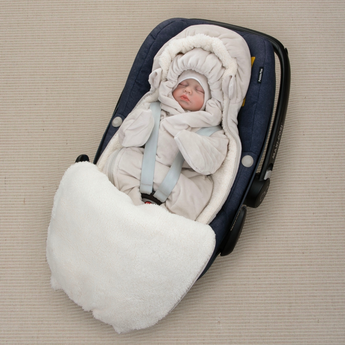 1. Конверт из плюша с подкладом из шерпы (две молнии по бокам для полного открытия конверта, утягивающая резинка по контуру капюшона, прорези для автокресла, защитные клапаны по краям молний)