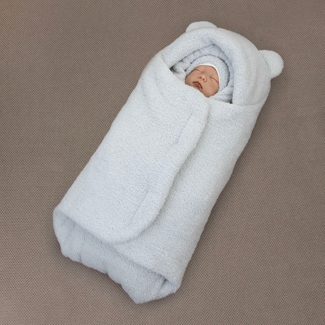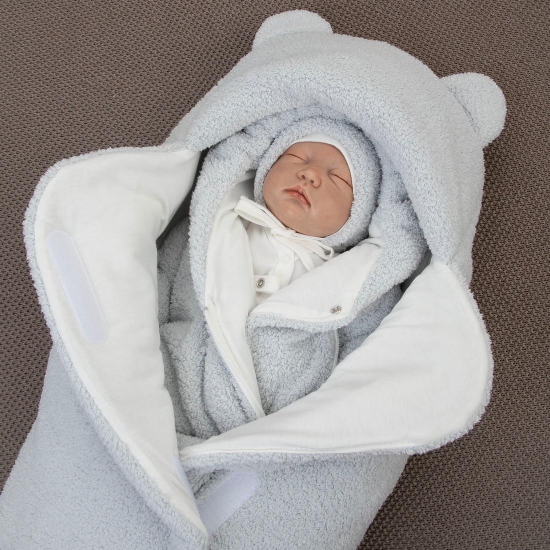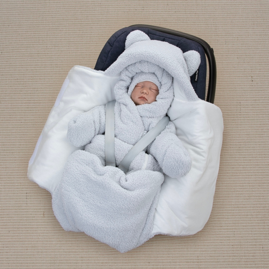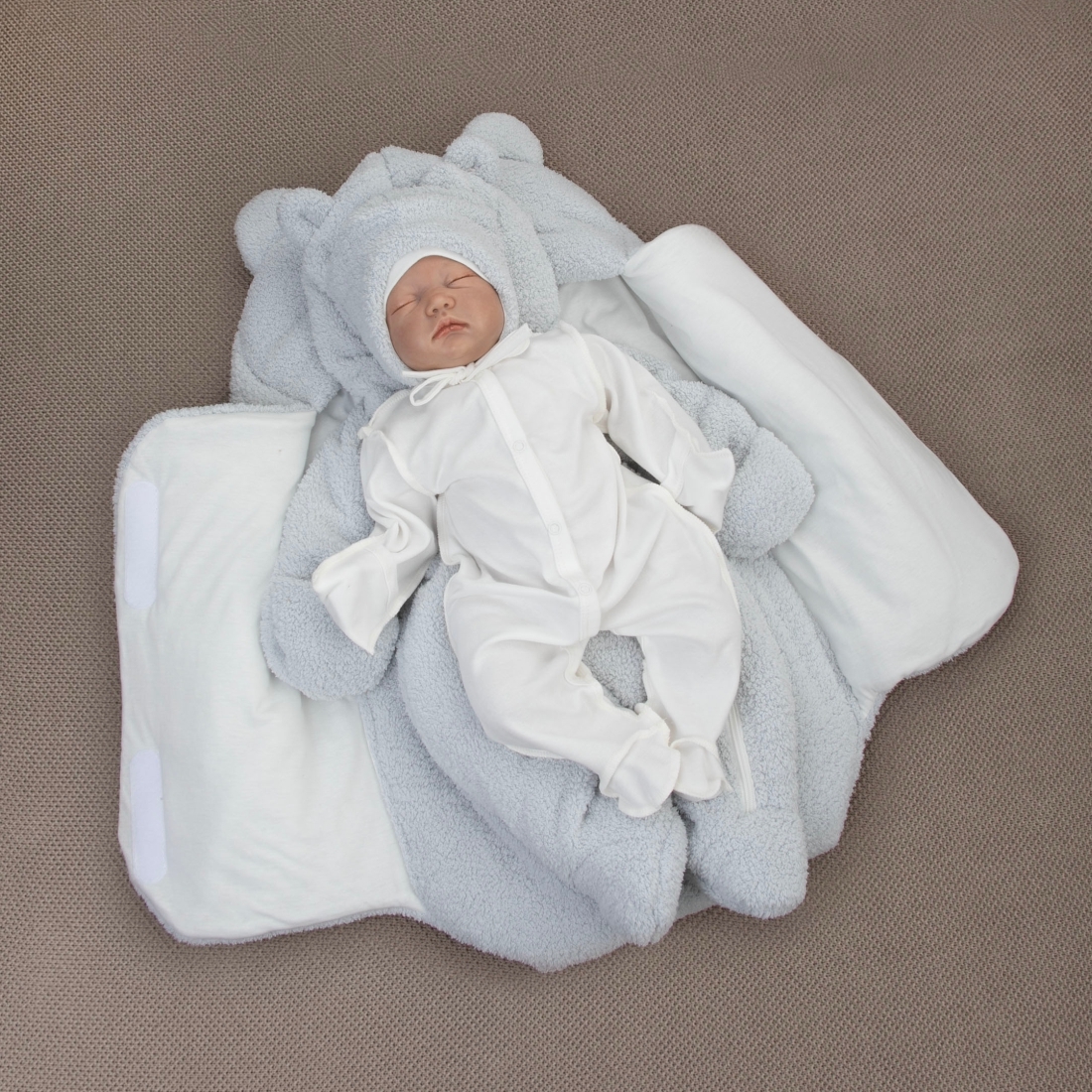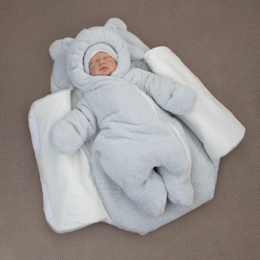 1. Конверт из велсофта барашек (конверт мешок с капюшоном и застежкой внахлест на «липучках», утягивающая резинка по контуру капюшона, прорези для автокресла)
