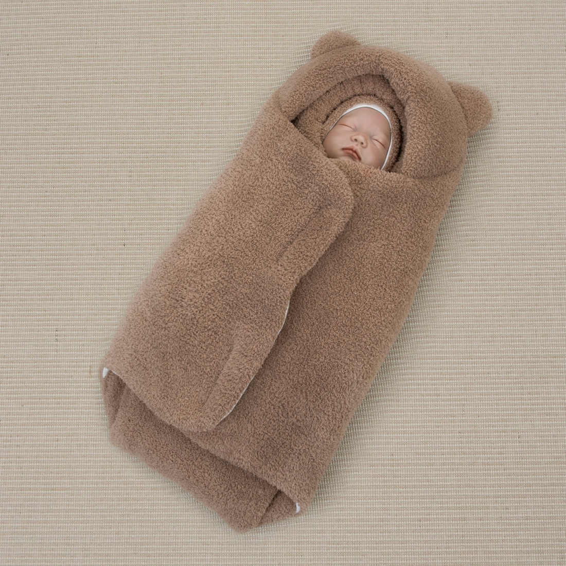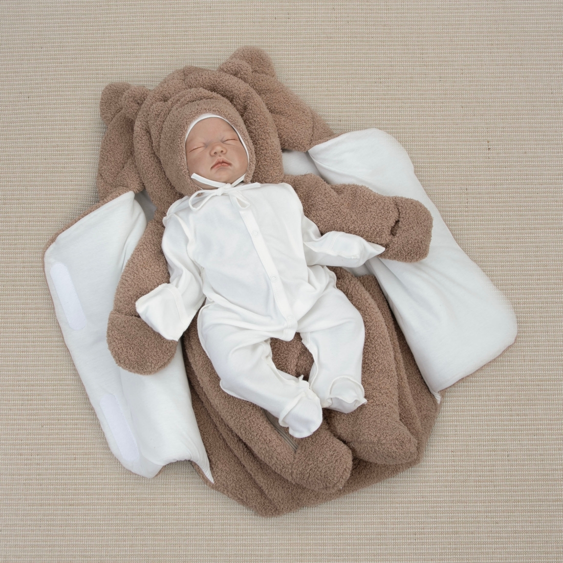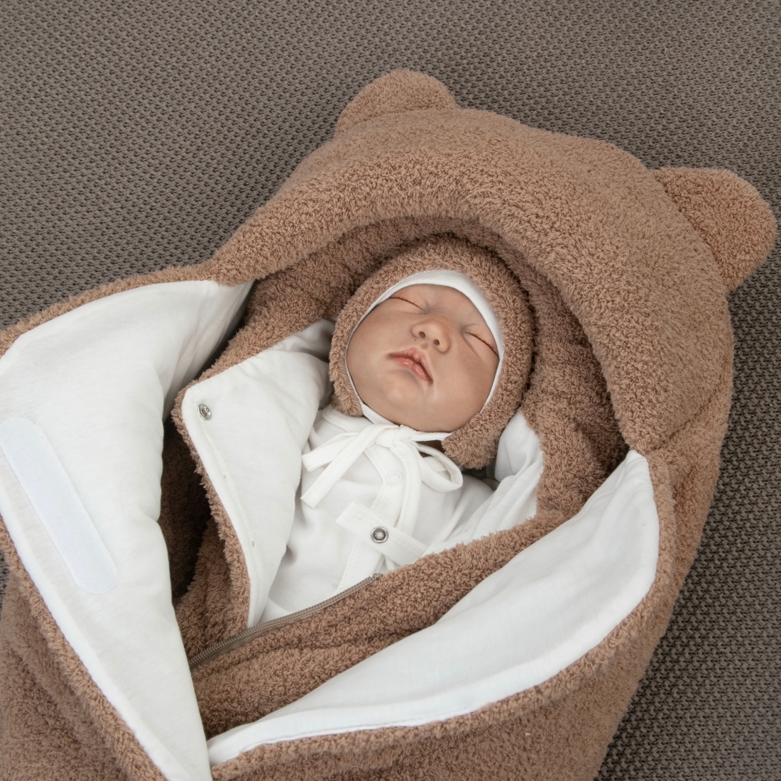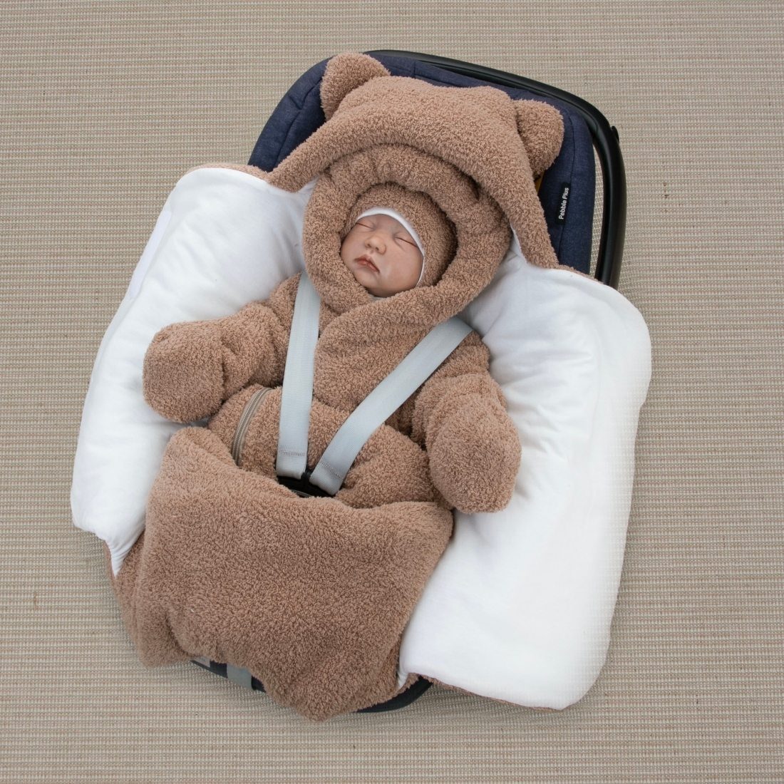 1. Конверт из велсофта барашек (конверт мешок с капюшоном и застежкой внахлест на «липучках», утягивающая резинка по контуру капюшона, прорези для автокресла)
