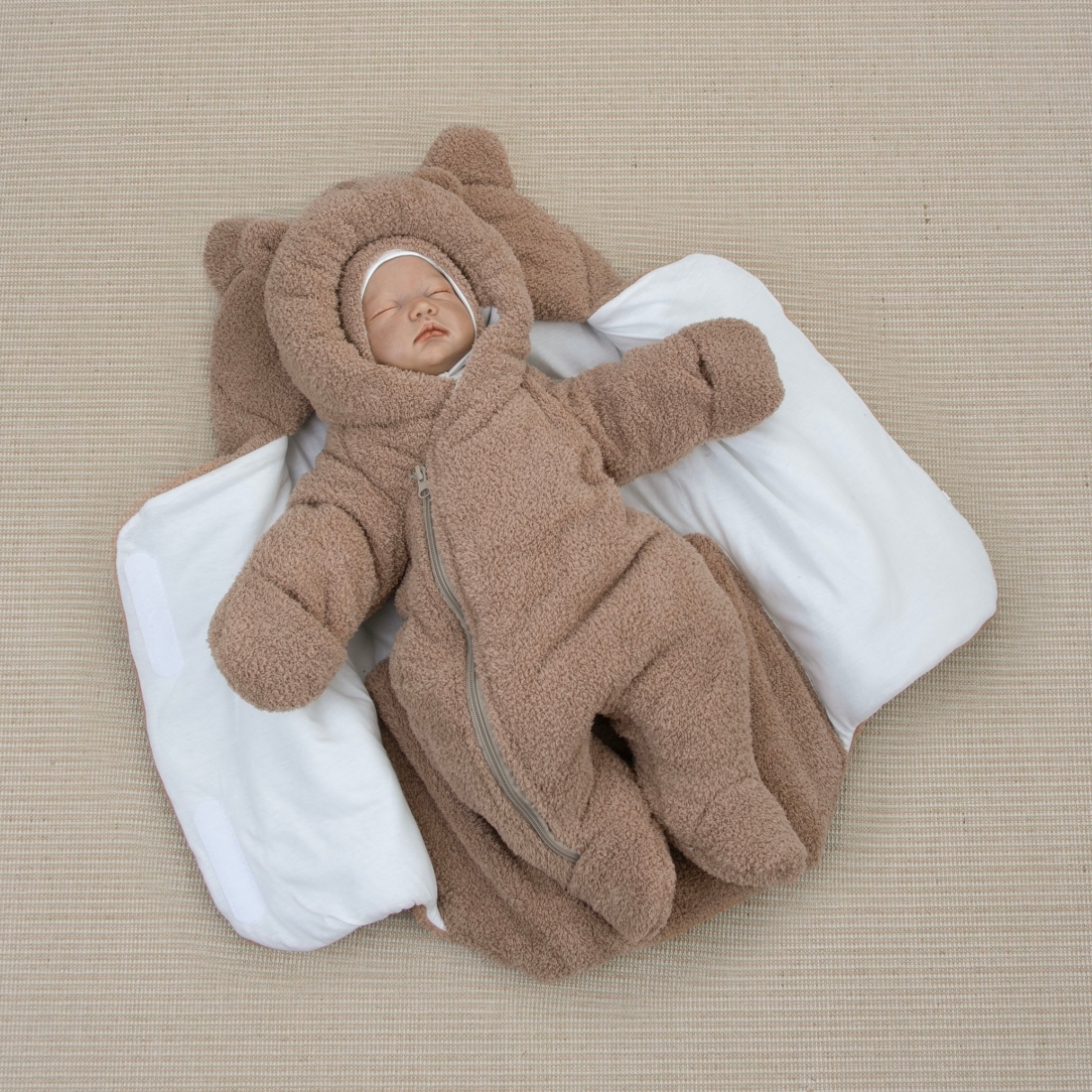 3. Комбинезон, утепленный из велсофта барашка с ушками (закрытые ножки, на рукавах отвороты, косая молния по длине изделия, капюшон с мягкой резинкой для плотного прилегания)