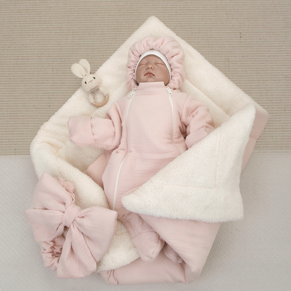 Комбинезона: верх - муслин (хлопок 100%), наполнитель - синтепон 100 г/м2,