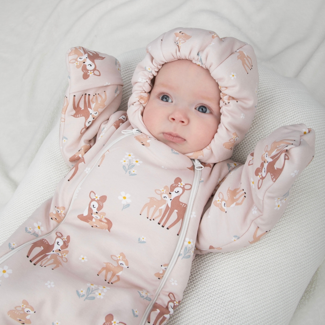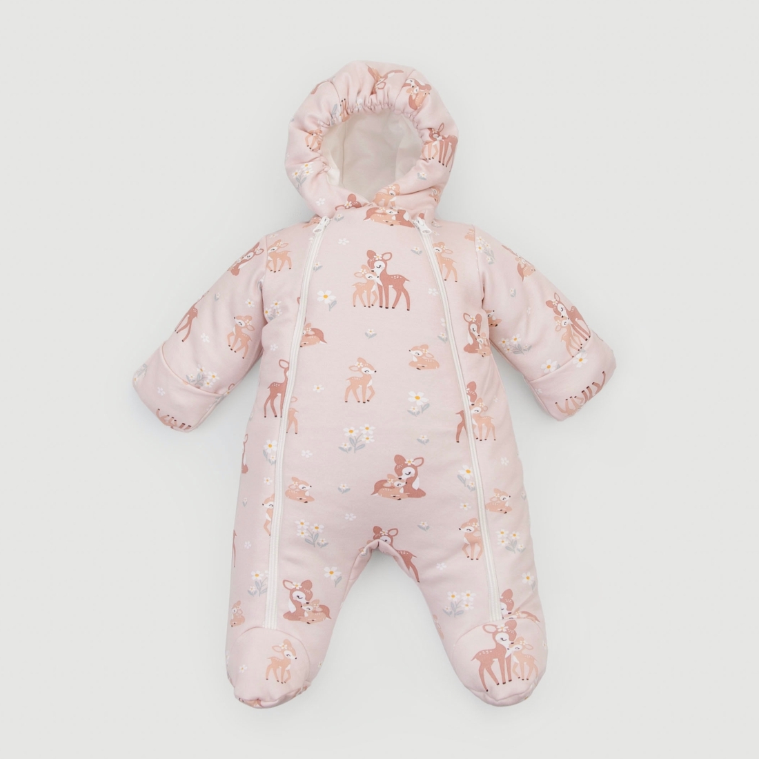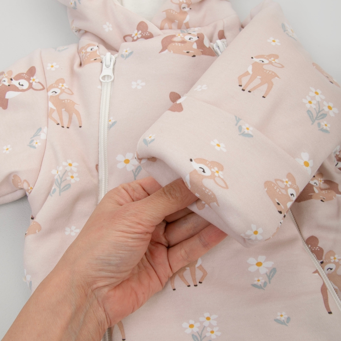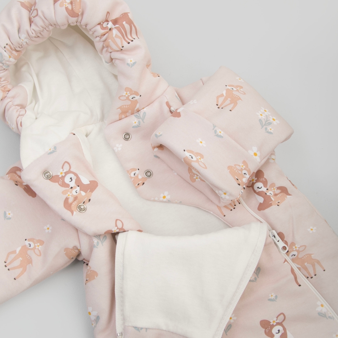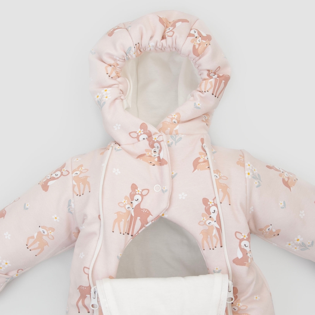 Отвороты на рукавах позволят спрятать ручки от ветра. Ножки закрыты