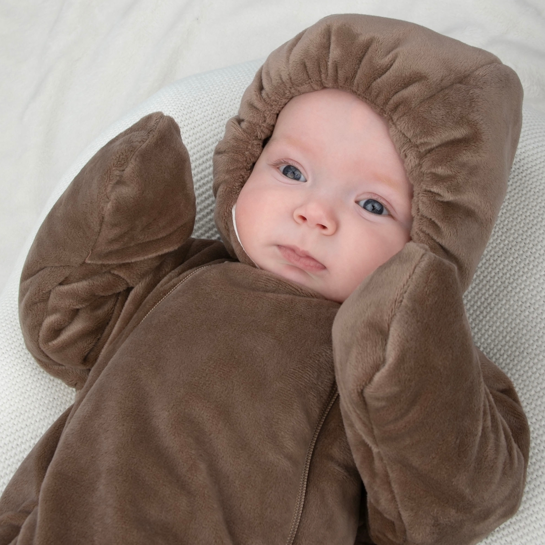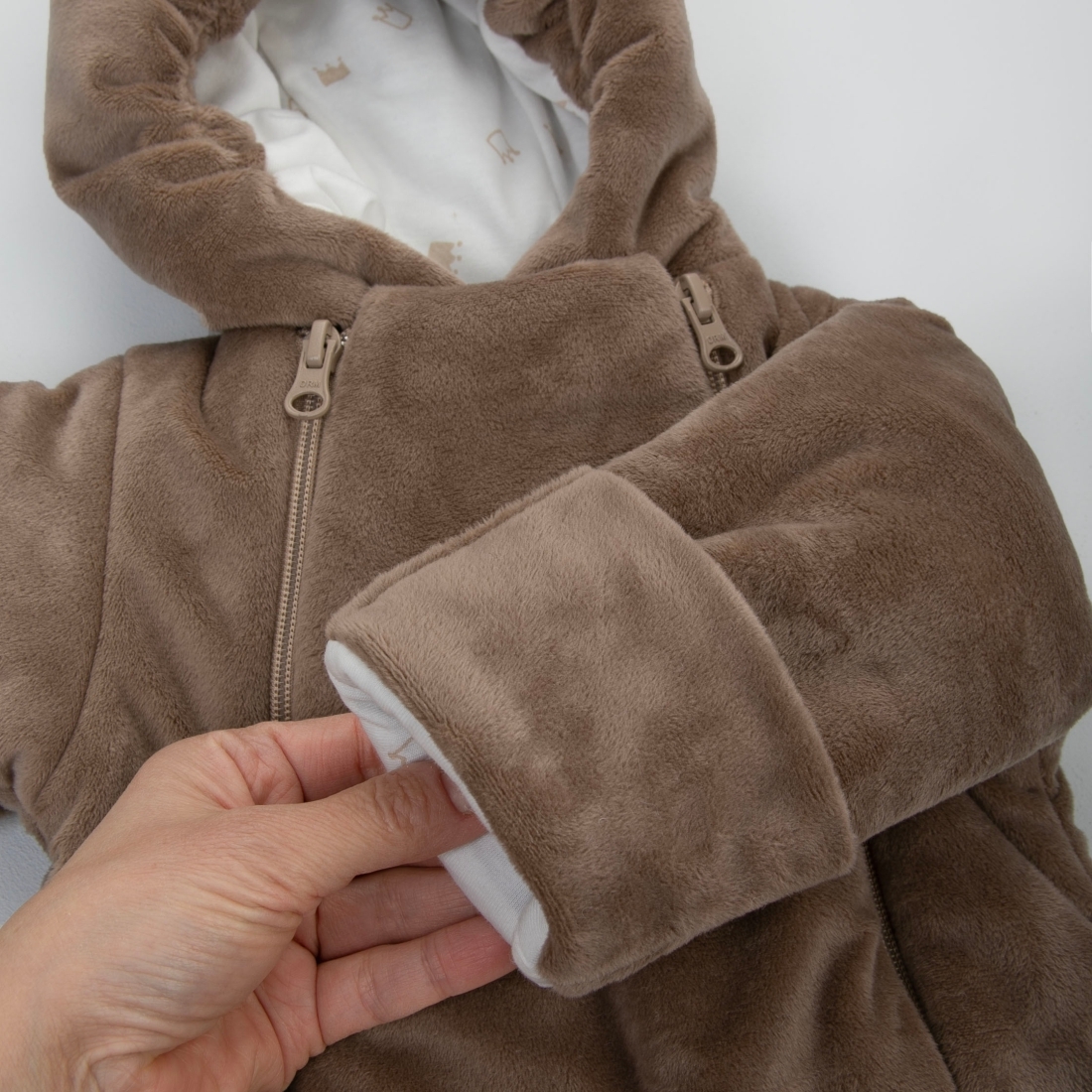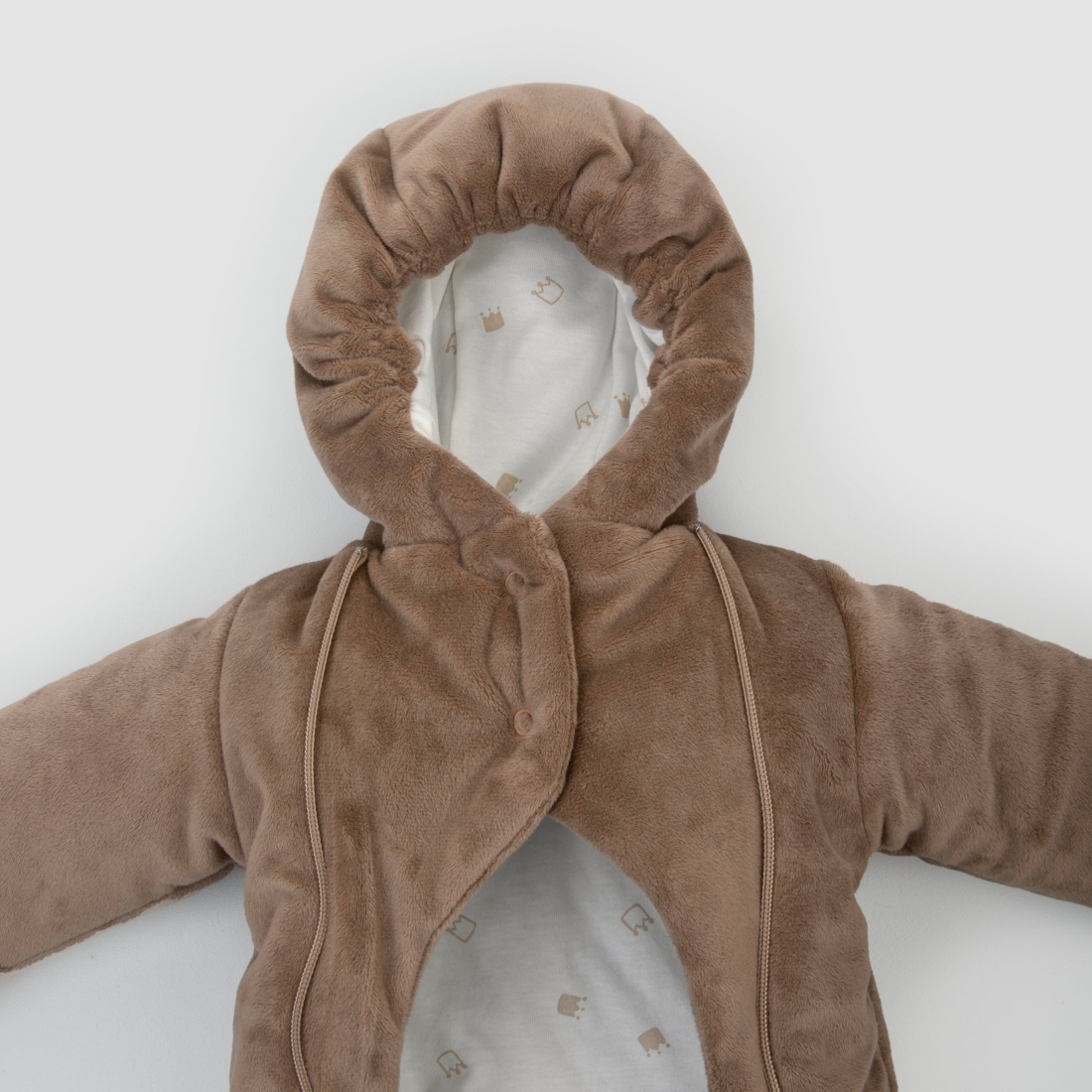 Отвороты на рукавах позволят спрятать ручки от ветра. Ножки закрыты