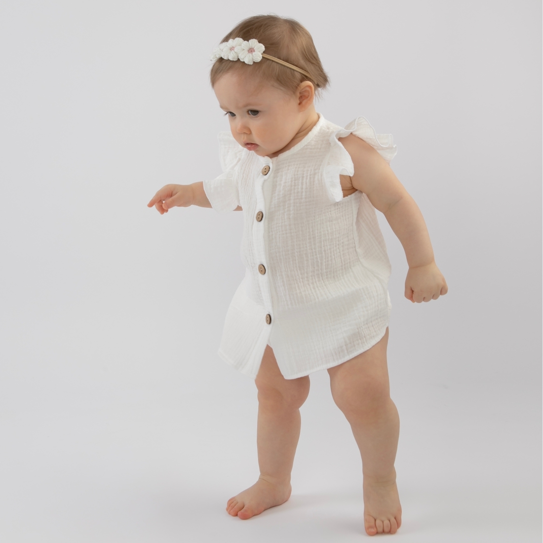 Свободный крой блузки не будет стеснять движений малышки. По передней половинке изделие застегивается на пуговицы.