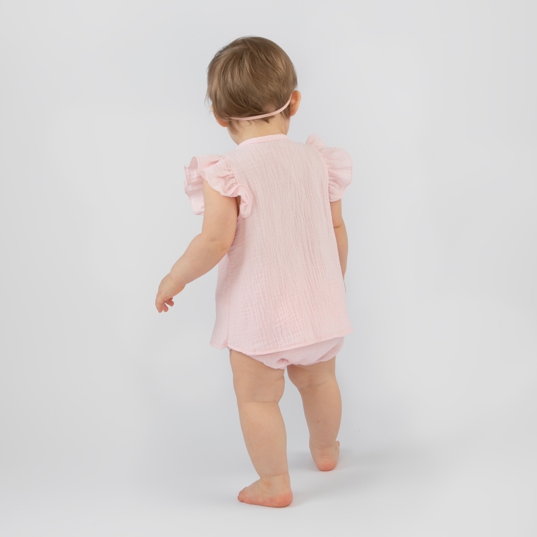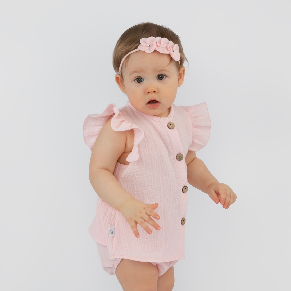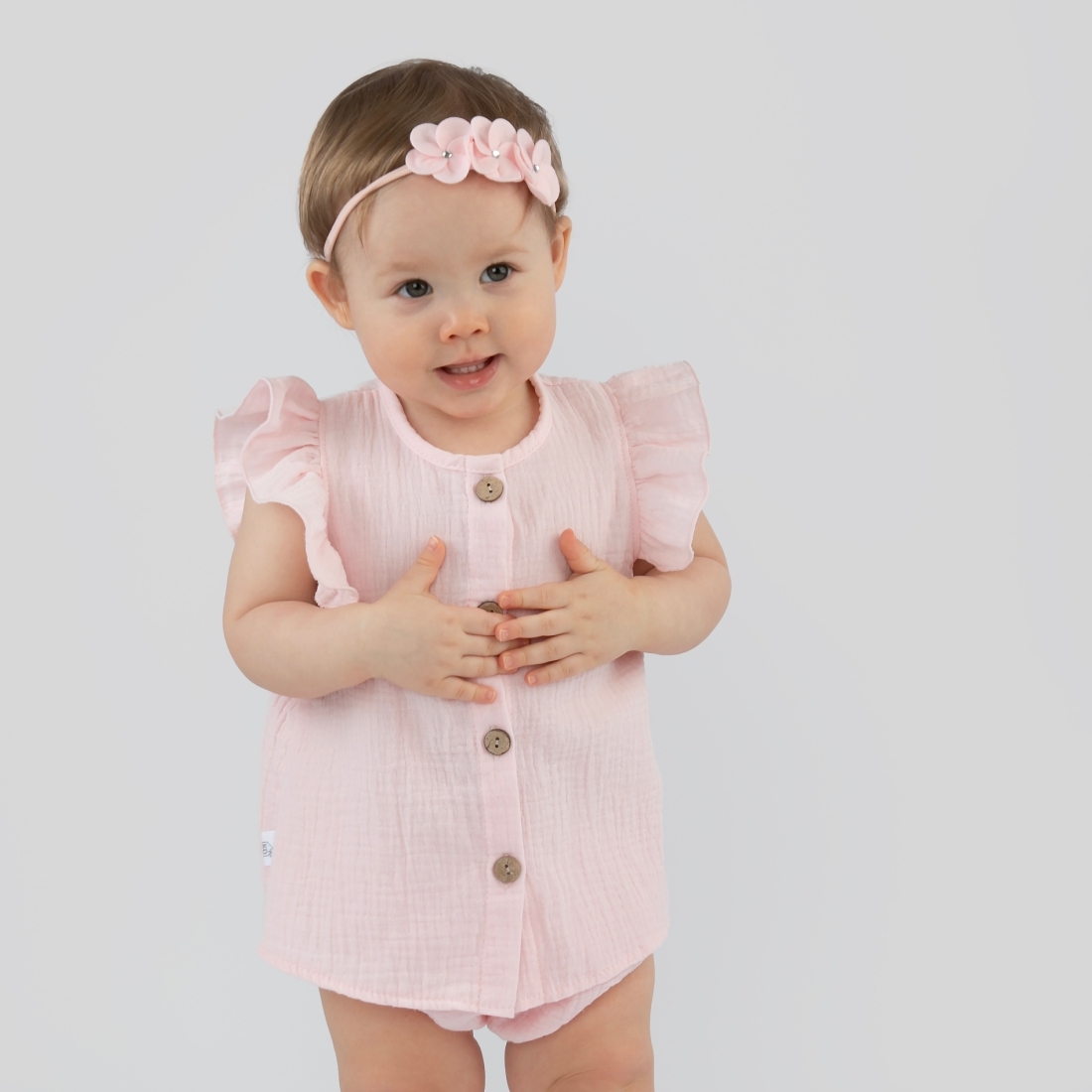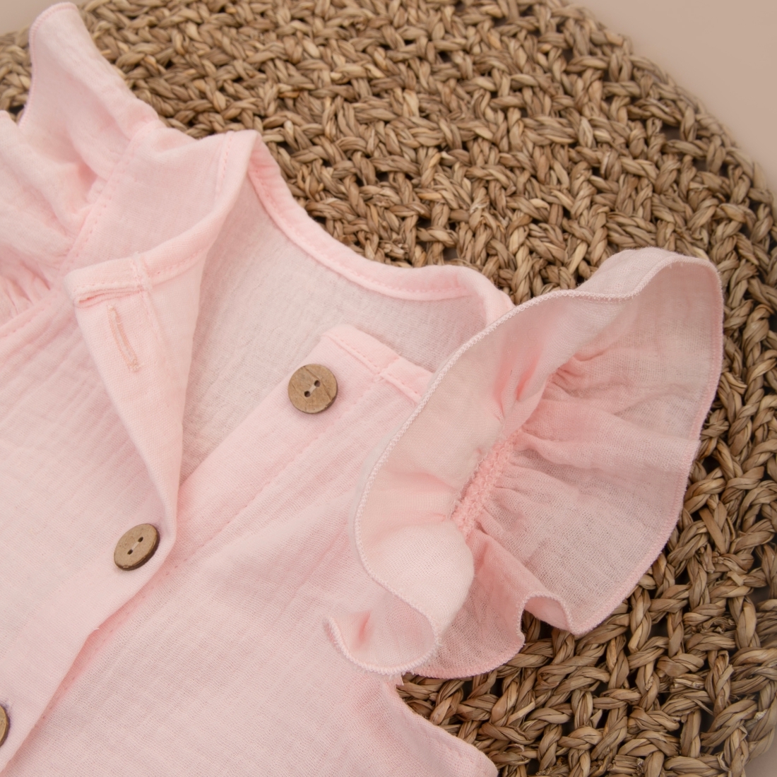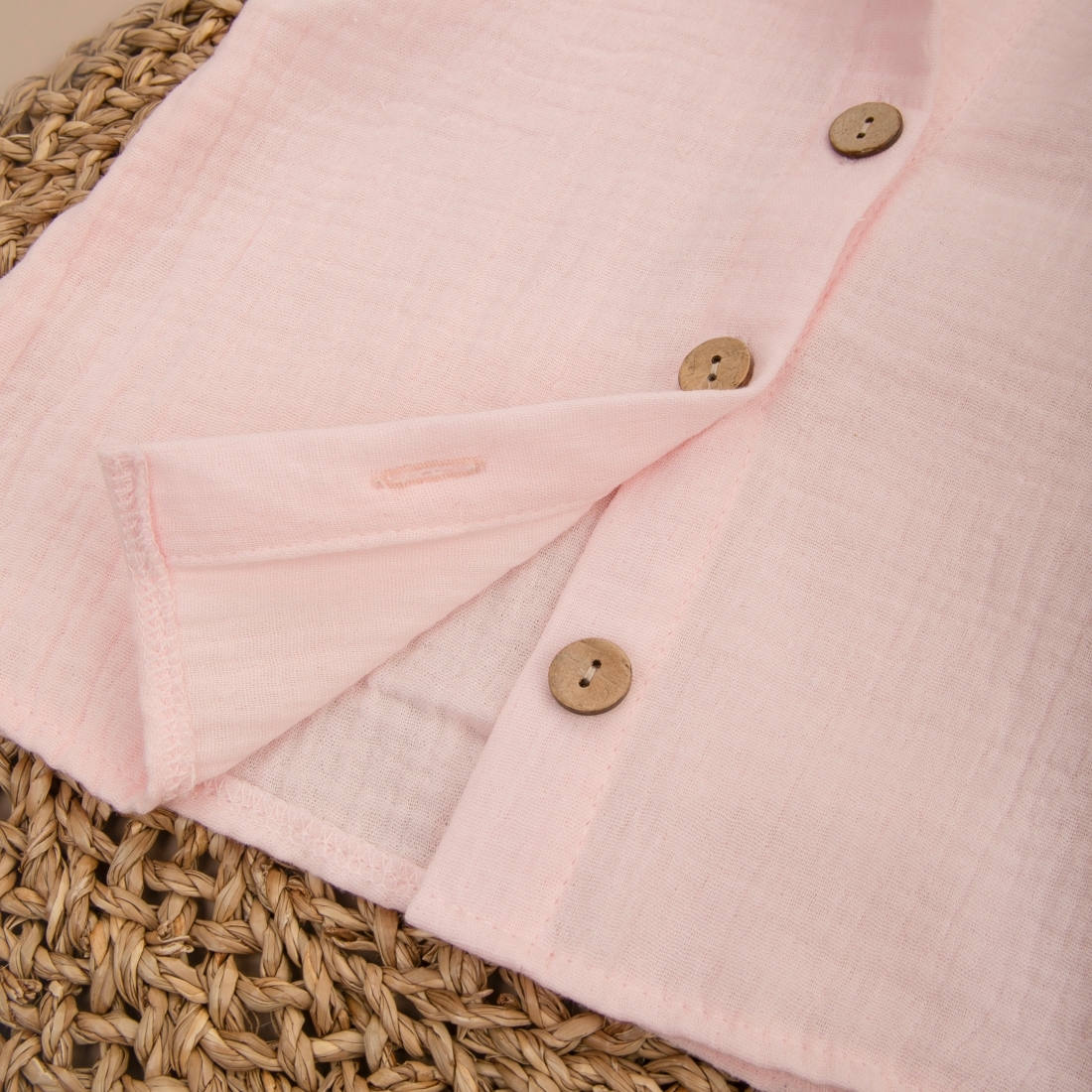 Свободный крой блузки не будет стеснять движений малышки. По передней половинке изделие застегивается на пуговицы.