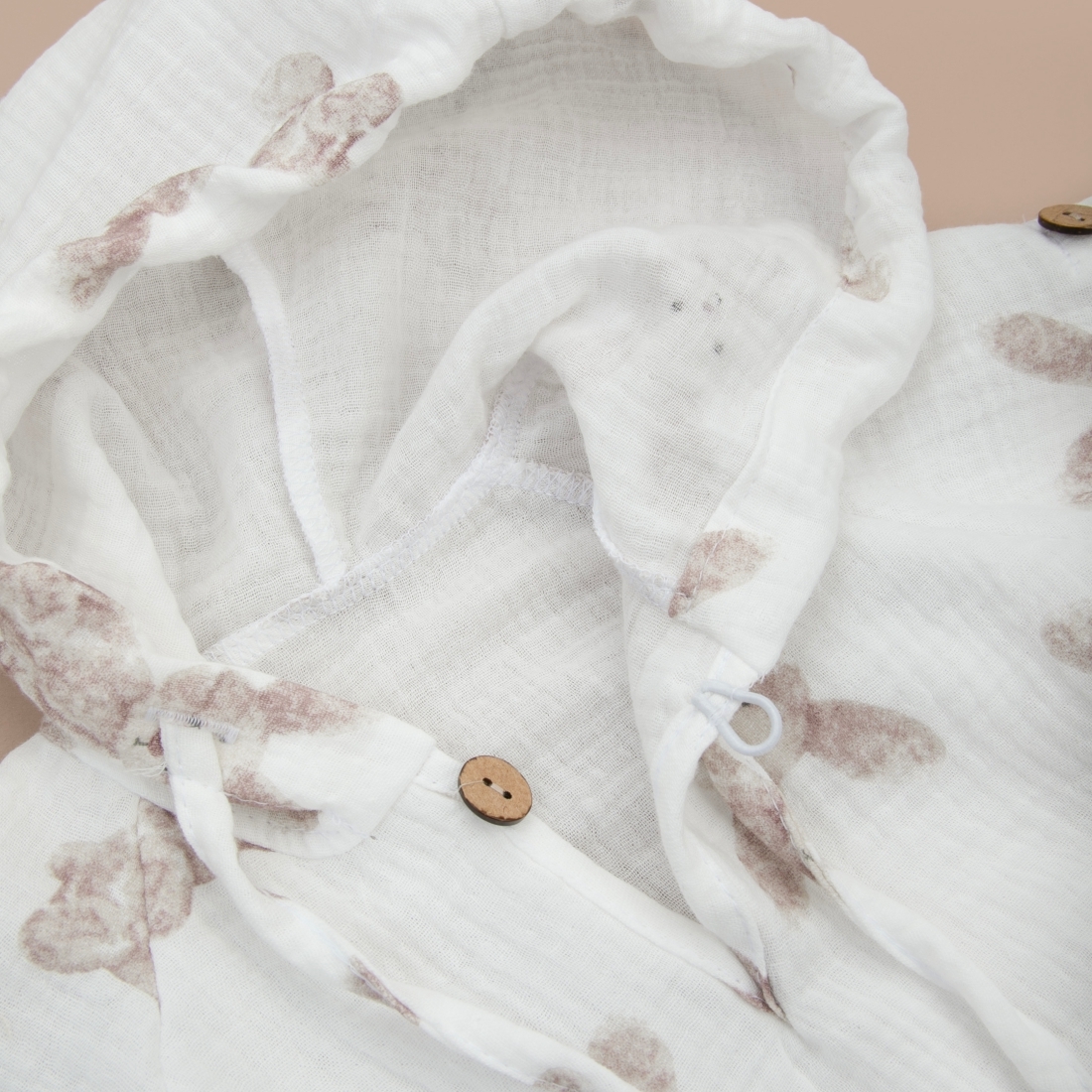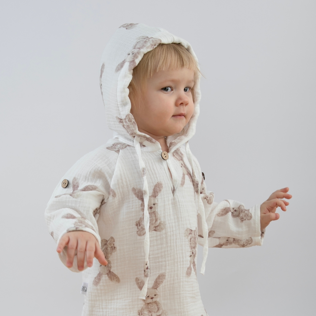 Глубокий капюшон со шнурком для фиксирования, так же можно использовать вместо головного убора для защиты солнца. Есть застежка на пуговицу по передней части изделия.