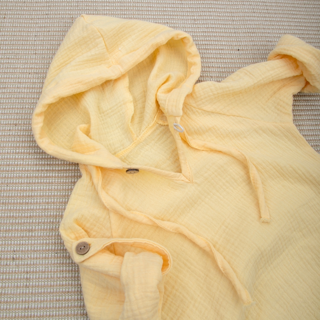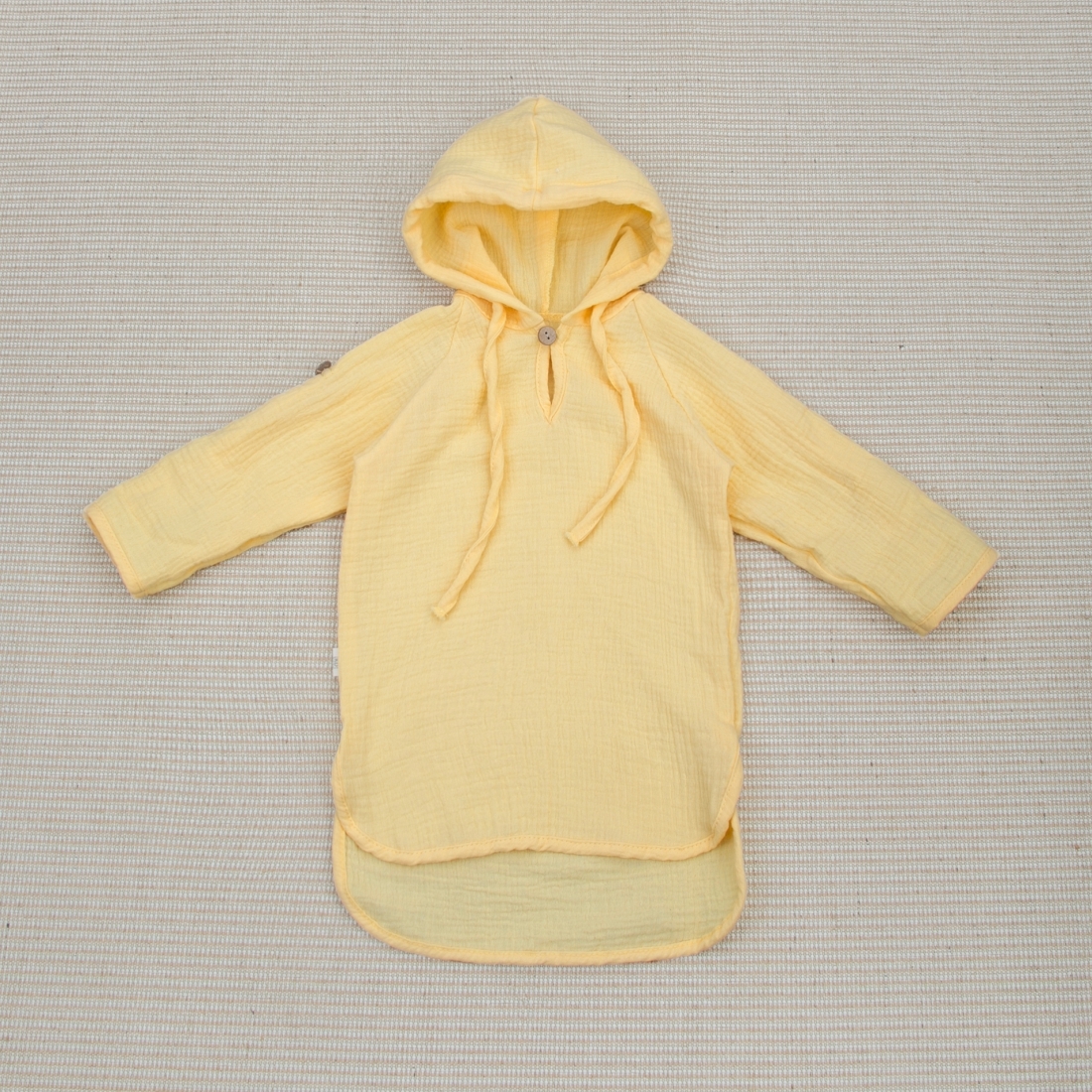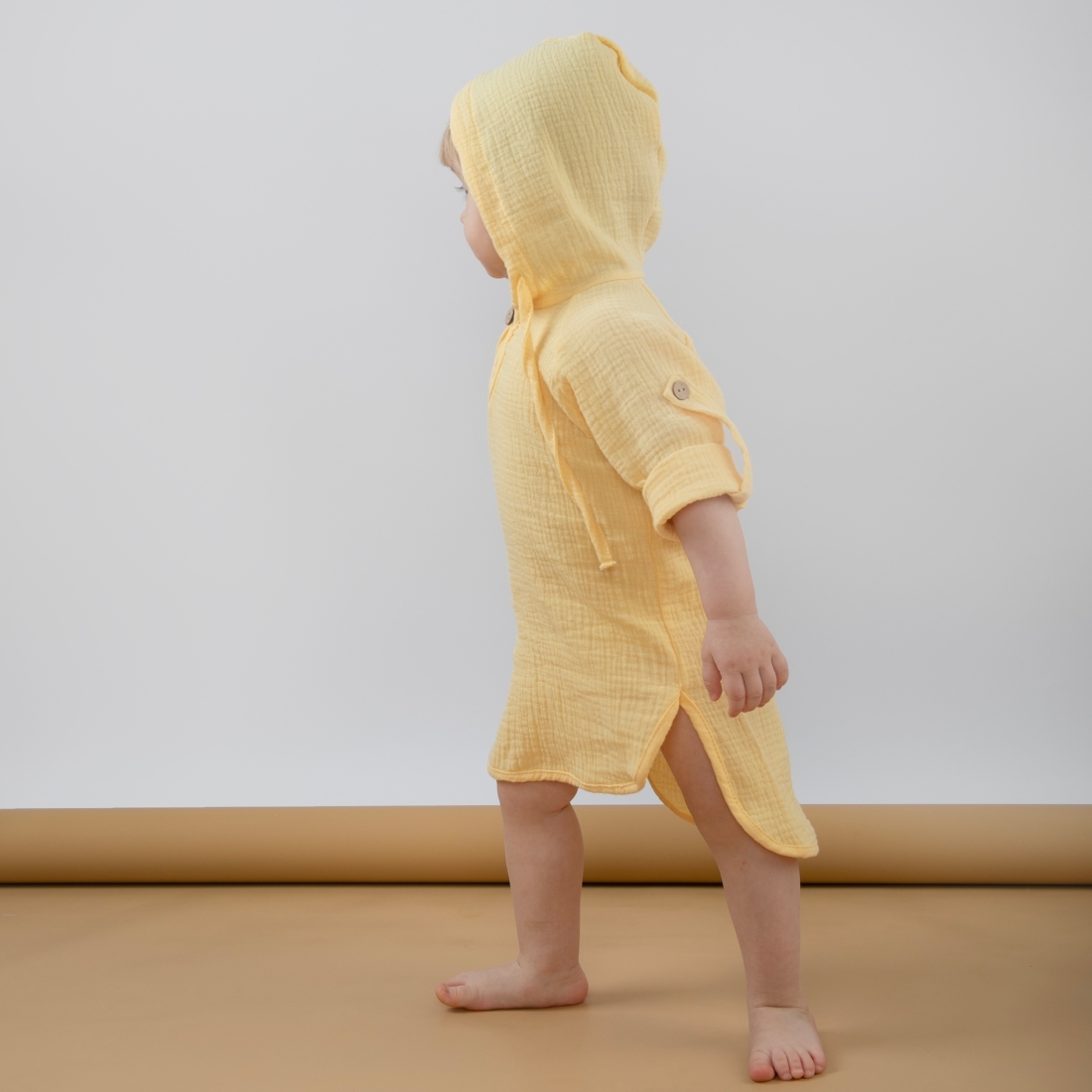 Глубокий капюшон со шнурком для фиксирования, так же можно использовать вместо головного убора для защиты солнца. Есть застежка на пуговицу по передней части изделия.