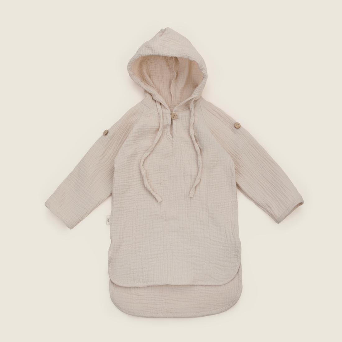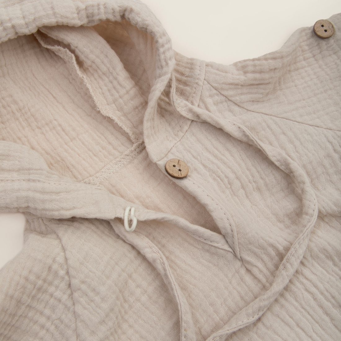 Глубокий капюшон со шнурком для фиксирования, так же можно использовать вместо головного убора для защиты солнца. Есть застежка на пуговицу по передней части изделия.