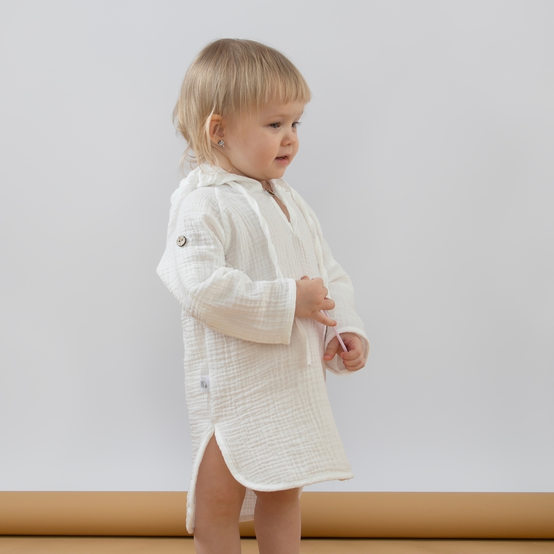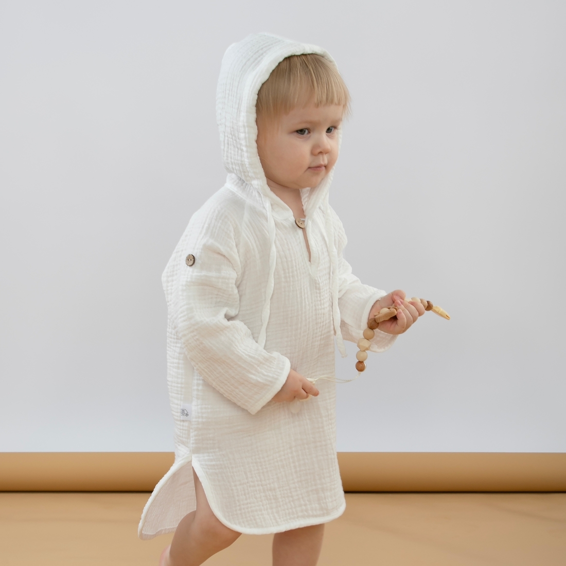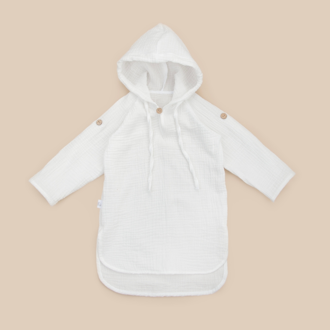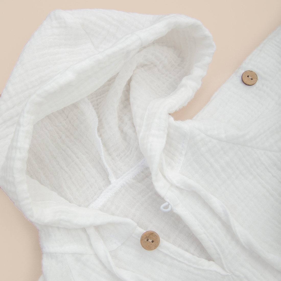 Глубокий капюшон со шнурком для фиксирования, так же можно использовать вместо головного убора для защиты солнца. Есть застежка на пуговицу по передней части изделия.