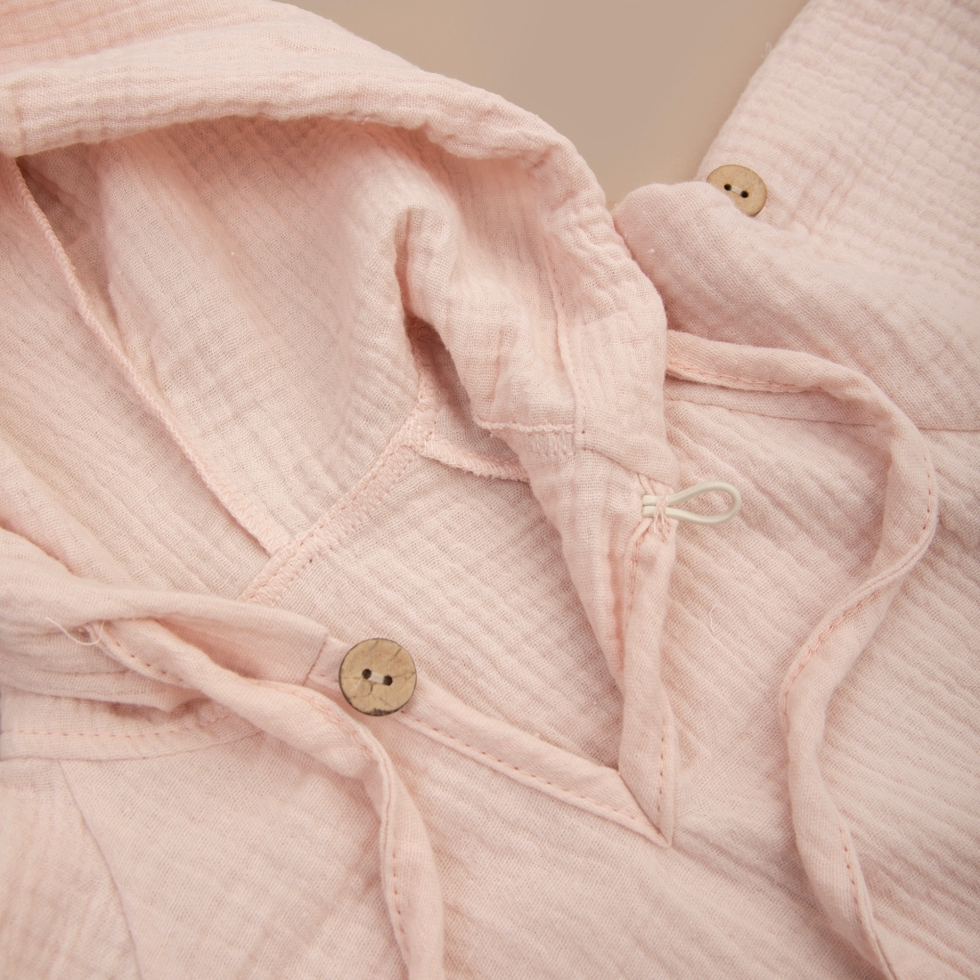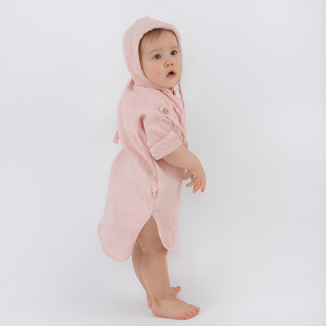 Глубокий капюшон со шнурком для фиксирования, так же можно использовать вместо головного убора для защиты солнца. Есть застежка на пуговицу по передней части изделия.