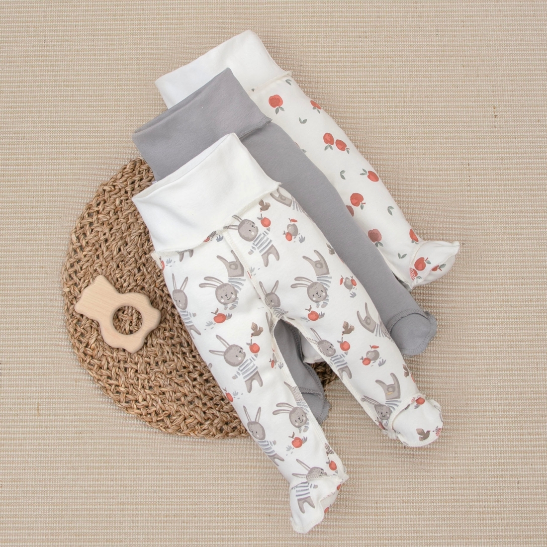 Комплект из трех ползунков разного цветового исполнения на широком мягком поясе-резинке.