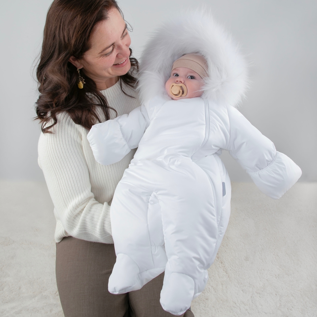 Зимний комбинезон «Новый Дивини-1» с отстегивающейся опушкой на капюшоне и с отворотами на рукавичках.