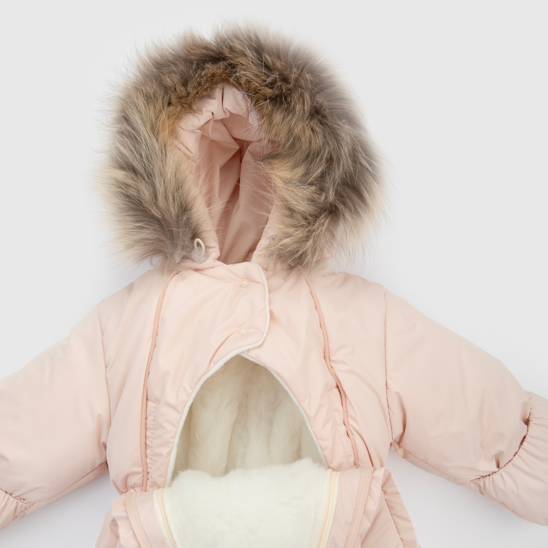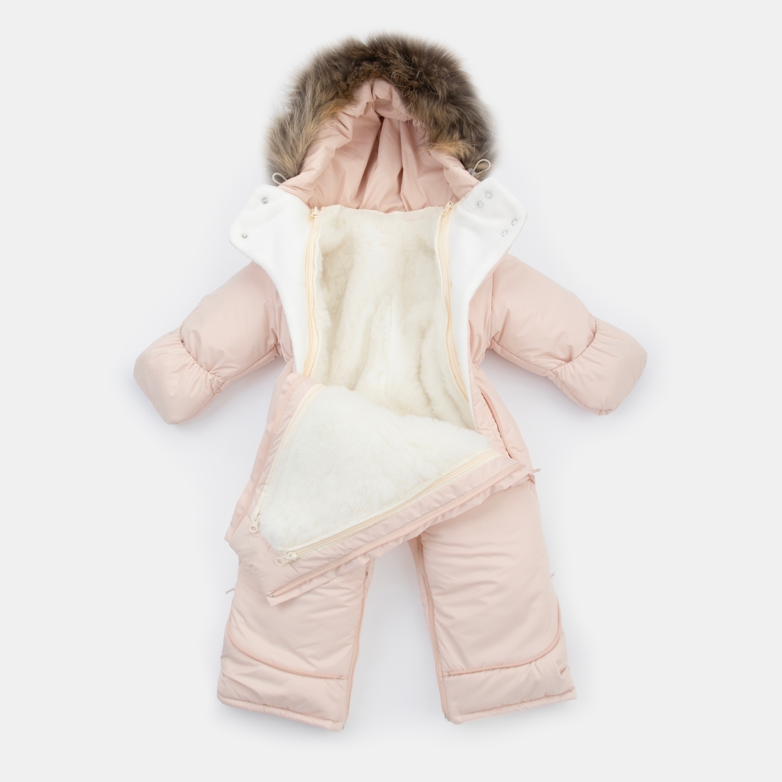 Комбинезон - трансформер "Фантазия", с отстегивающейся опушкой на капюшоне и отворотами на рукавах.