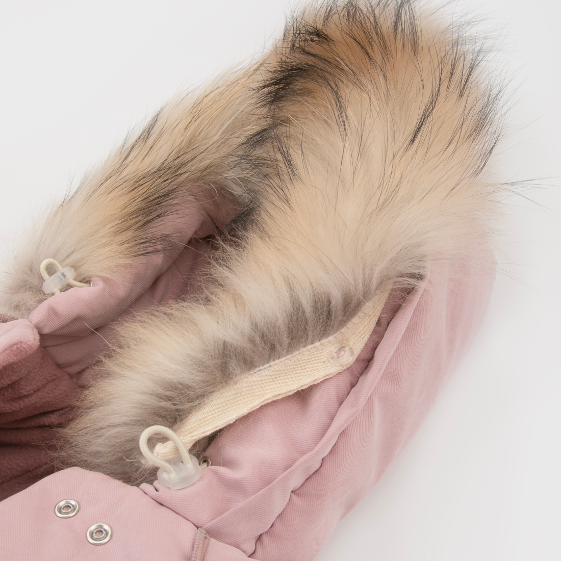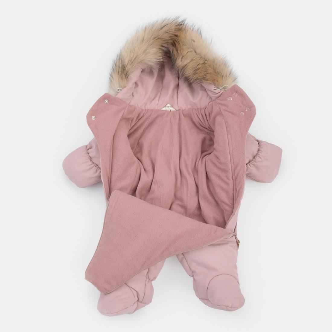 Зимний комбинезон «Новый Дивини-1» с отстегивающейся опушкой на капюшоне и с отворотами на рукавичках.
