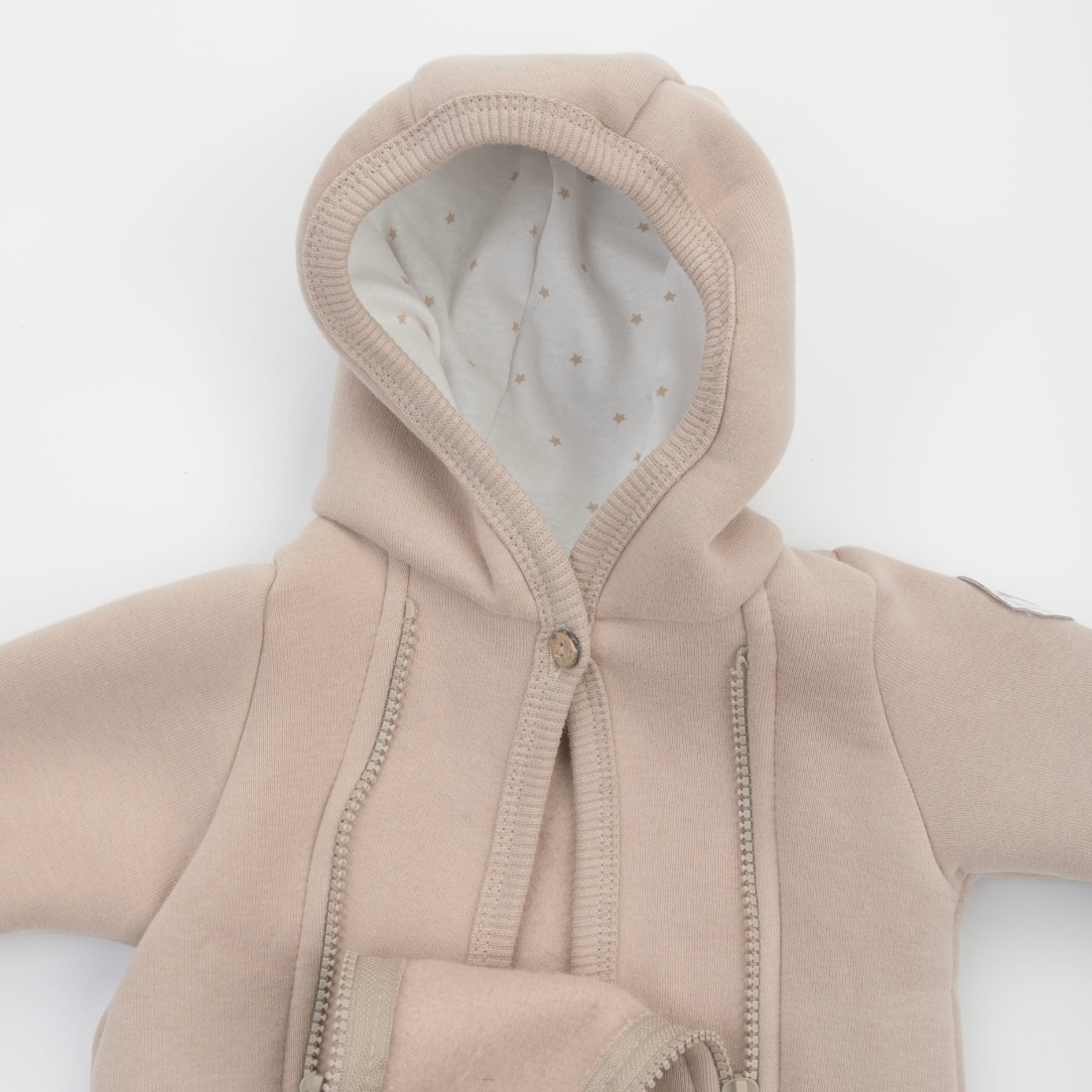 Две молнии по бокам от горловины до середины ножек, что делает процесс одевания малыша простым и удобным.