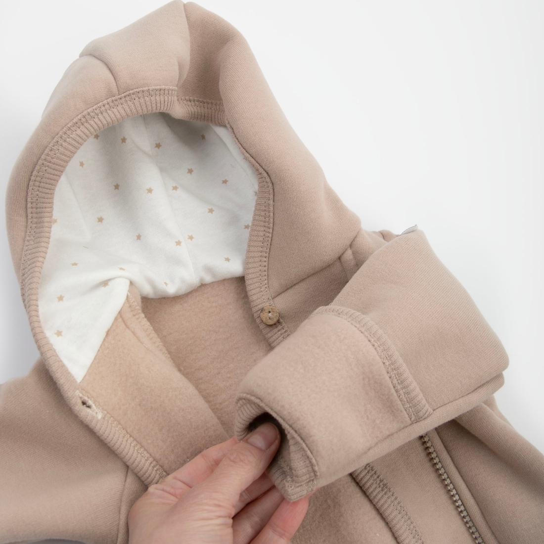 Отвороты на рукавах позволят спрятать ручки от ветра. Ножки закрыты